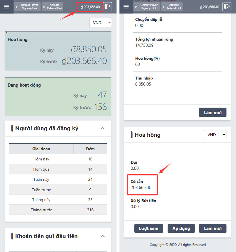 1. Sau khi nhận được đại lý xét duyệt và tùy chọn rút tiền của bạn đã được bật, hãy đăng nhập vào tài khoản đại lý của bạn để thực hiện rút tiền hoa hồng. Trước tiên, hãy kiểm tra xem hoa hồng của bạn đã có thể rút hay chưa. Nếu hoa hồng của bạn vẫn hiển thị là “ĐỢI”, vui lòng đợi cho đến khi tiền hoa hồng hiển thị là “CÓ SẴN” trước.