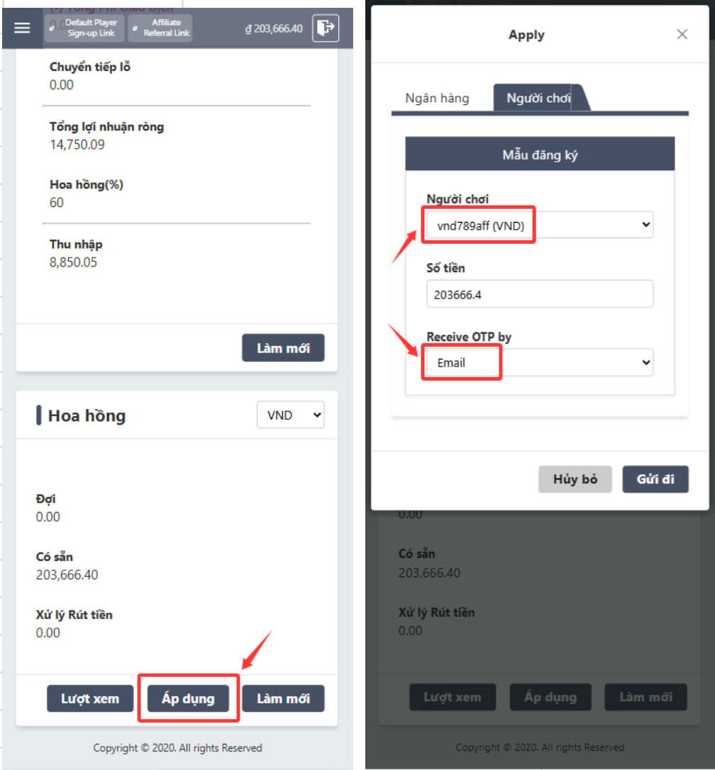 2. Khi hoa hồng của bạn hiển thị “CÓ SẴN”, hãy nhấp vào ÁP DỤNG và bạn sẽ thấy tài khoản người chơi đã được liên kết. Chọn tài khoản người chơi này và tiến hành nhận OTP qua Email hoặc Số điện thoại (lưu ý rằng email hoặc số điện thoại này phải được xác minh trước), tiến hành lấy OTP và nhập đúng OTP. Sau đó, hệ thống sẽ thông báo tiền hoa hồng đã chuyển về tài khoản người chơi thành công và đại lý có thể tiếp tục việc rút tiền thông qua tài khoản ngân hàng địa phương nằm trong tài khoản người chơi.